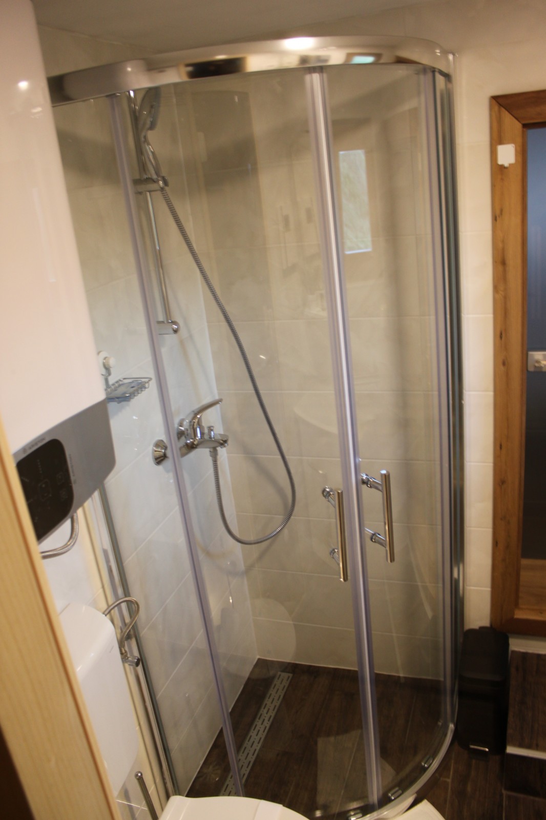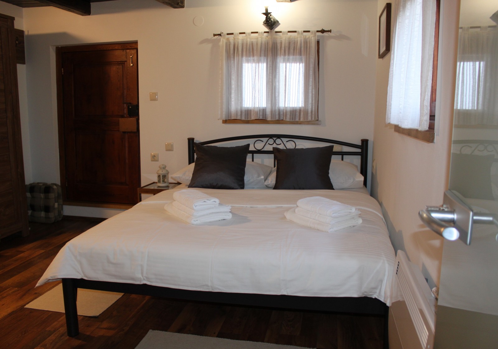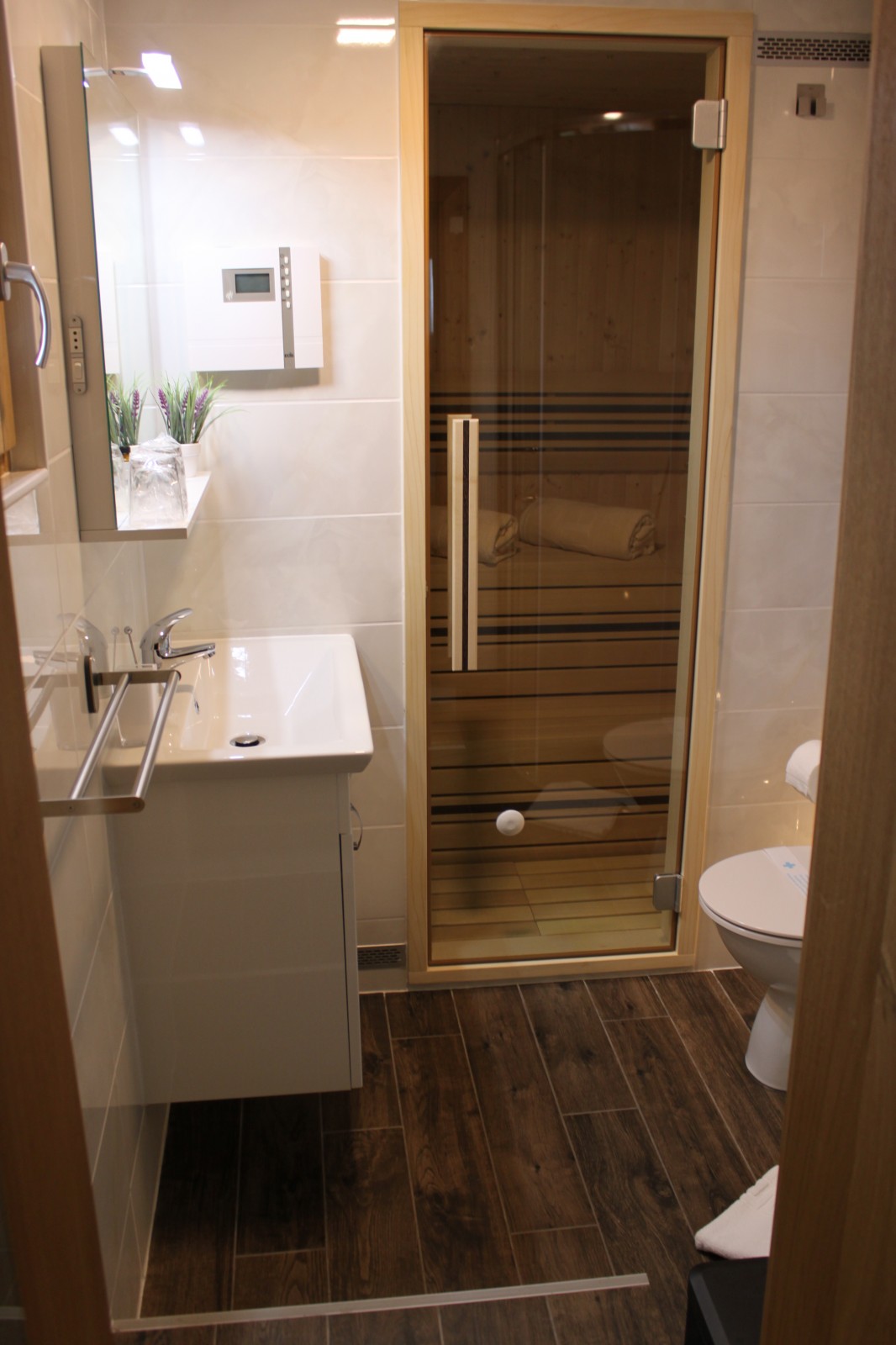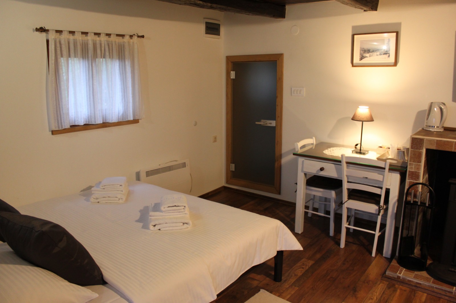 Floor: double bed, fireplace, electric heater, couch, sauna, TV, kettle, work desk. Also exit to a balcony that is closed on both sides
